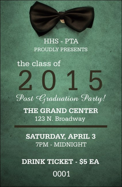 Let your guests enjoy a drink to go with their fancy attire when you sell Bow Tie Drink Tickets at your event. With an elegant, sea-green background and the image of a little black bow tie on the template, along with sequential numbering to keep everything secure, these tickets will have everyone saying, “Cheers!”
