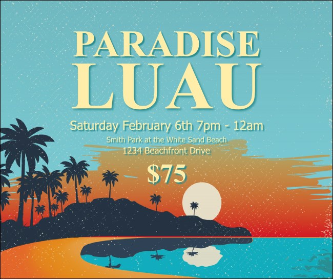 Bring the palm trees, sunset, and your bash’s details to your followers’ streams with the Beach Facebook Post. One glance at its tropical scene and everyone will be ready to escape! This Facebook post template enables you to customize information and typeface, as well as add images and more text. Tailor it to your needs, approve your instant proof, and download for free!