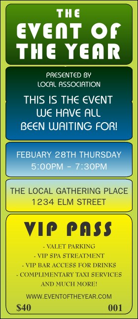 Give back to those who have given more. Offer special perks when you distribute the Squares VIP Pass. Colors fade from dark green to deep blue and bright yellow on this fun design, with event and VIP details in curvy white and grey text. Use this template for concerts, art shows, or community festivals!